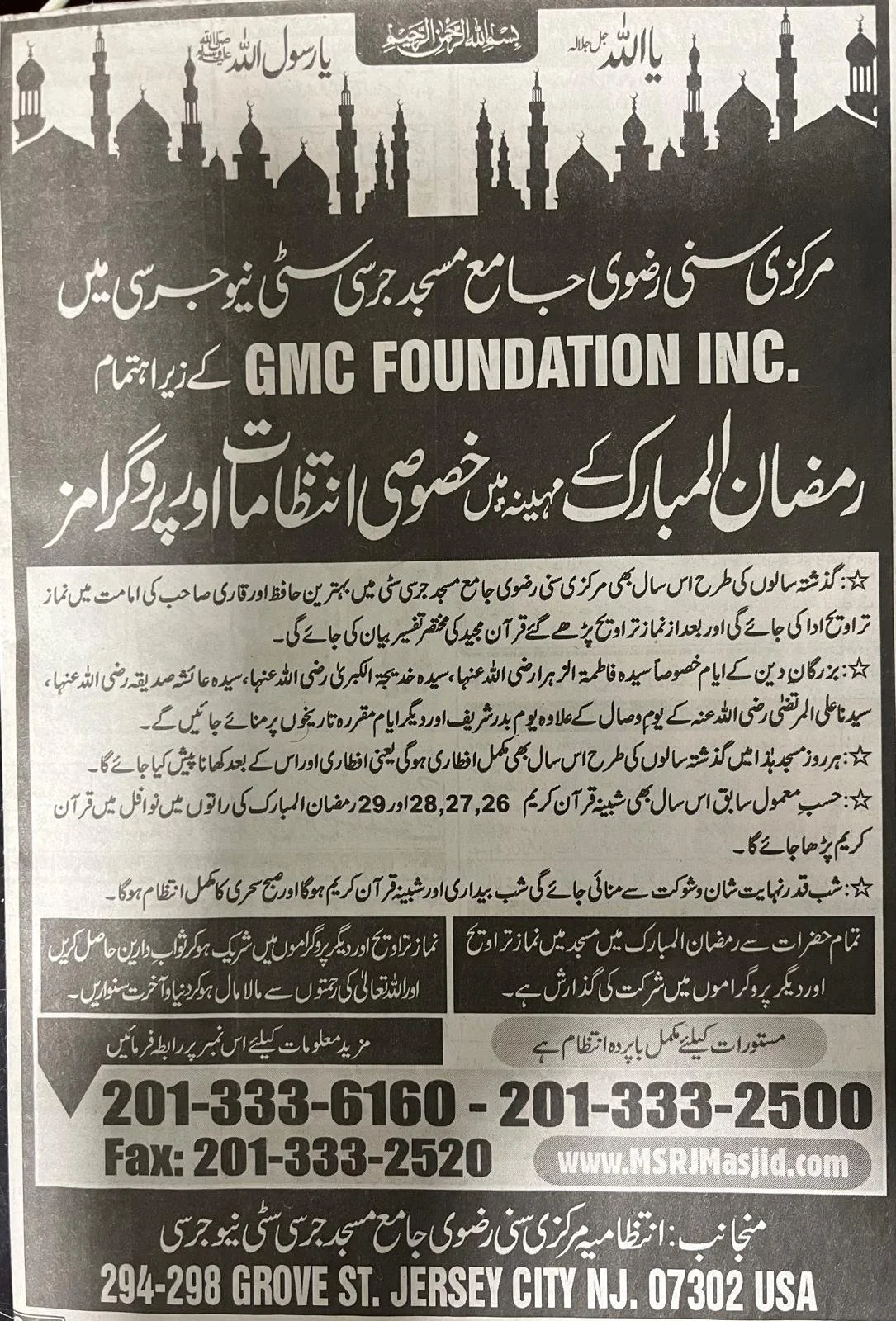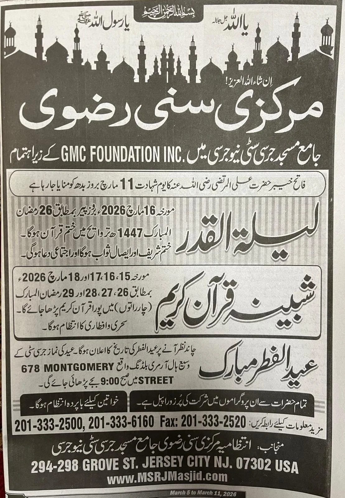 Located in Downtown, Jersey City, Markazi Sunni Rizvi Jamia Masjid provides a multitude of services to the Muslim Community and to all those who show an interest in it.